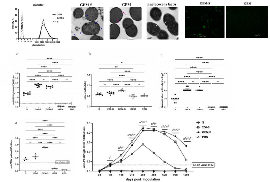 GEM 颗粒载体是该团队2013 年自主构建的核心技术平台,以食品级乳酸菌灭活细胞壁骨架为原料,具有安全无毒、原料易得、成本低廉等突出优势,同时具备天然TLR-2 免疫激活活性,可同时承担抗原纯化介质、抗原递送载体、免疫佐剂三大功能。该平台已先后应用于猪圆环病毒疫苗、猪口蹄疫疫苗研制,成功实现病毒抗原高效纯化,充分验证了平台的安全性与实用性。经过持续优化升级,将 GEM 颗粒平台拓展至亚单位疫苗研发领域,有效突破了传统亚单位疫苗纯化流程繁琐、免疫原性偏低等行业瓶颈。依托蛋白锚定(PA)技术,可实现抗原与载体一步结合、一步离心纯化展示,制备过程温和简单高效,兼具免疫增强效果,大幅缩短研发周期、降低生产成本,适合规模化工业生产。