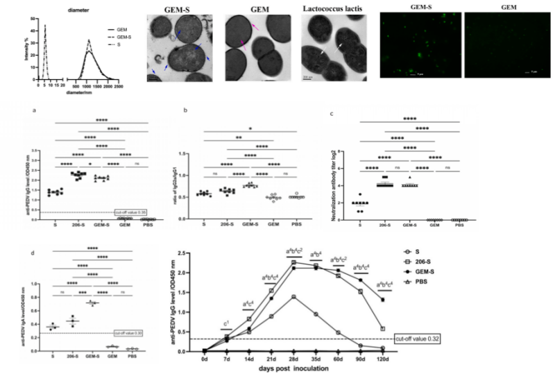 在本项研究中,团队将 PEDV S 蛋白与PA融合表达,高效展示于 GEM 颗粒表面,成功构建均一稳定的颗粒型抗原 GEM-S。与可溶性抗原和常规油佐剂疫苗相比,基于 GEM 平台制备的疫苗展现出显著优势:可快速激活淋巴结免疫应答,显著上调细胞因子与趋化因子表达,促进抗原呈递细胞募集与树突状细胞成熟;诱导产生更高水平的肠道黏膜 IgA,形成更均衡的 Th1/Th2 免疫反应;提高血清抗体效价,免疫持久性显著优于传统佐剂。同时,GEM 载体安全性高,具备良好的临床应用潜力。